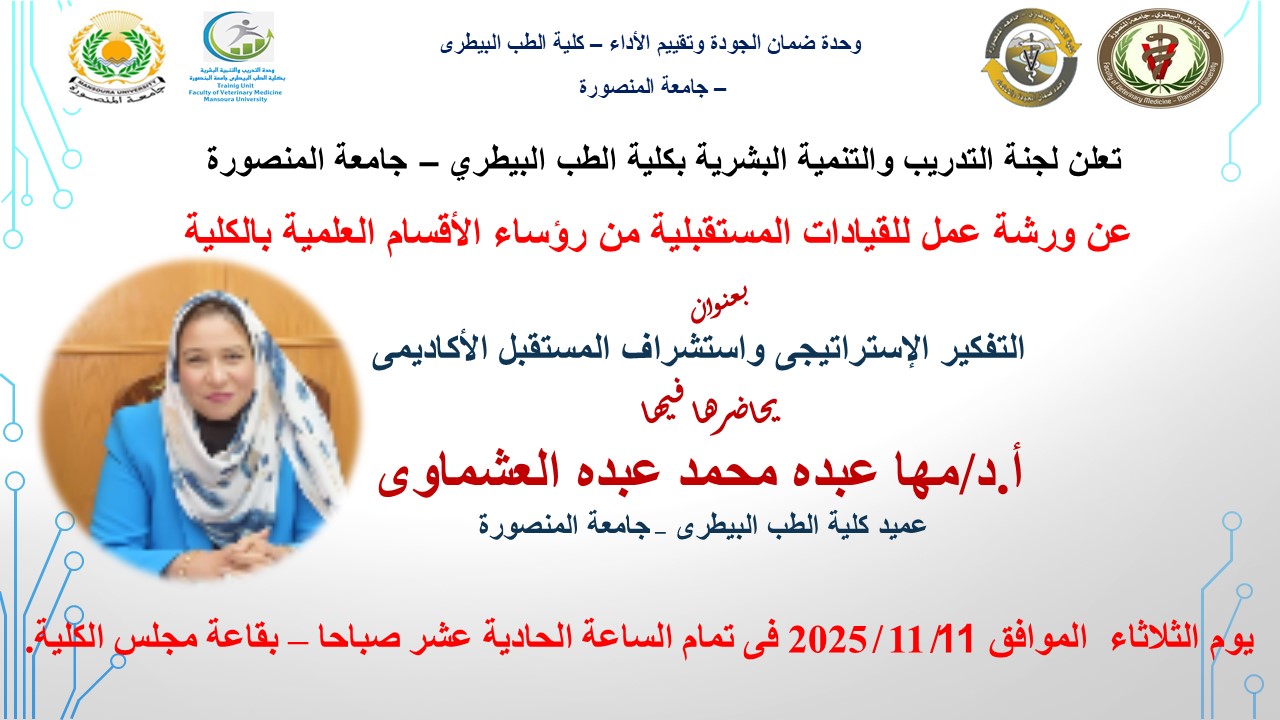 تم تنفيذ ورشة عمل (للقيادات المستقبلية من رؤساء الأقسام العلمية بالكلية) تحت عنوان (التفكير الإستراتيجي و استشراف المستقبل الأكاديمي) وذلك يوم الثلاثاء الاموافق 11/11/2025